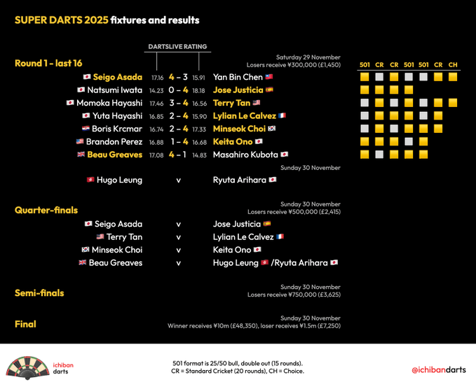 It is Asada v Justiica, Tan v Le Calvez, Choi v Ono and Greaves vs the winner of the final Last 16 tie before the semi-finals and finals. The winner receives 10million yen which is £48,350 in GBP.