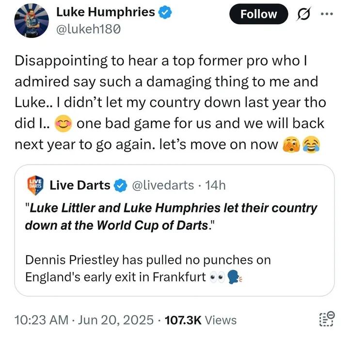 "Disappointing to hear a top former pro who I admired say such a damaging thing to me and Luke..." Humphries reacts, pointing out how he actually won the World Cup of Darts in 2024. "I didn’t let my country down last year tho did I..."