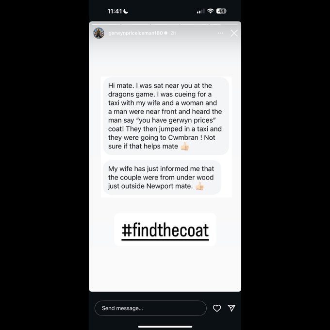 A later Story featured a message sent to him by a witness, claiming they had overheard a man saying, โyou have Gerwyn Priceโs coatโ before getting into a taxi heading towards Cwmbran. The same witness added that the couple involved were believed to be from Underwood, just outside Newport.