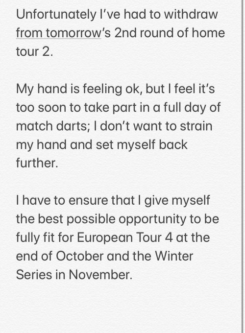 "Unfortunately I've had to withdraw from tomorrow's 2nd round of PDC Home Tour II. My hand is feeling ok, but I feel it's too soon to take part in a full day of match darts. I don't want to strain my hand and set myself back further," he wrote on Twitter.