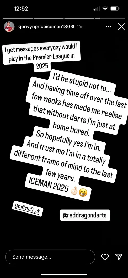 Although it might be coincidental, just a day after Aspinall's comments to Online Darts were posted, Price has now taken to his Instagram stories to make a complete U-turn in regards to his potential Premier League Darts selection. "I get messages everyday would I play in the Premier League in 2025," begins the former world champion's message. "I'd be stupid not to."
