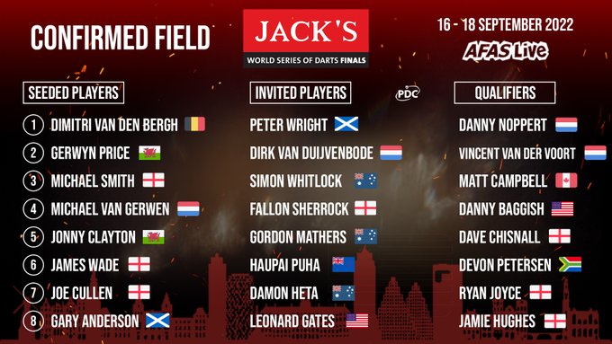 As are Michael Smith, James Wade, Joe Cullen and Gary Anderson solely through the World Series Order of Merit as seeds. Peter Wright who missed the triple-header in Australia and New Zealand due to surgery is not seeded and will be in action in the first round.