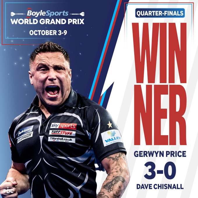 Price hit two ton plus checkouts with a high of 104 and punished a poor showing on the doubles from Chisnall with 3/20 hit by the St Helens ace.
