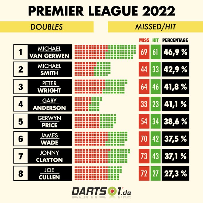 Das Wiedererstarken des Michael van Gerwen ist in der Premier League eng mit der zurückgekehrten Sicherheit auf die Doppel-Felder verknüpft. Mit knapp 47% hat der Niederländer mit Abstand die beste Trefferquote aller acht Spieler. #PLdarts #PremierLeagueDarts #Dartzn #CazooPL